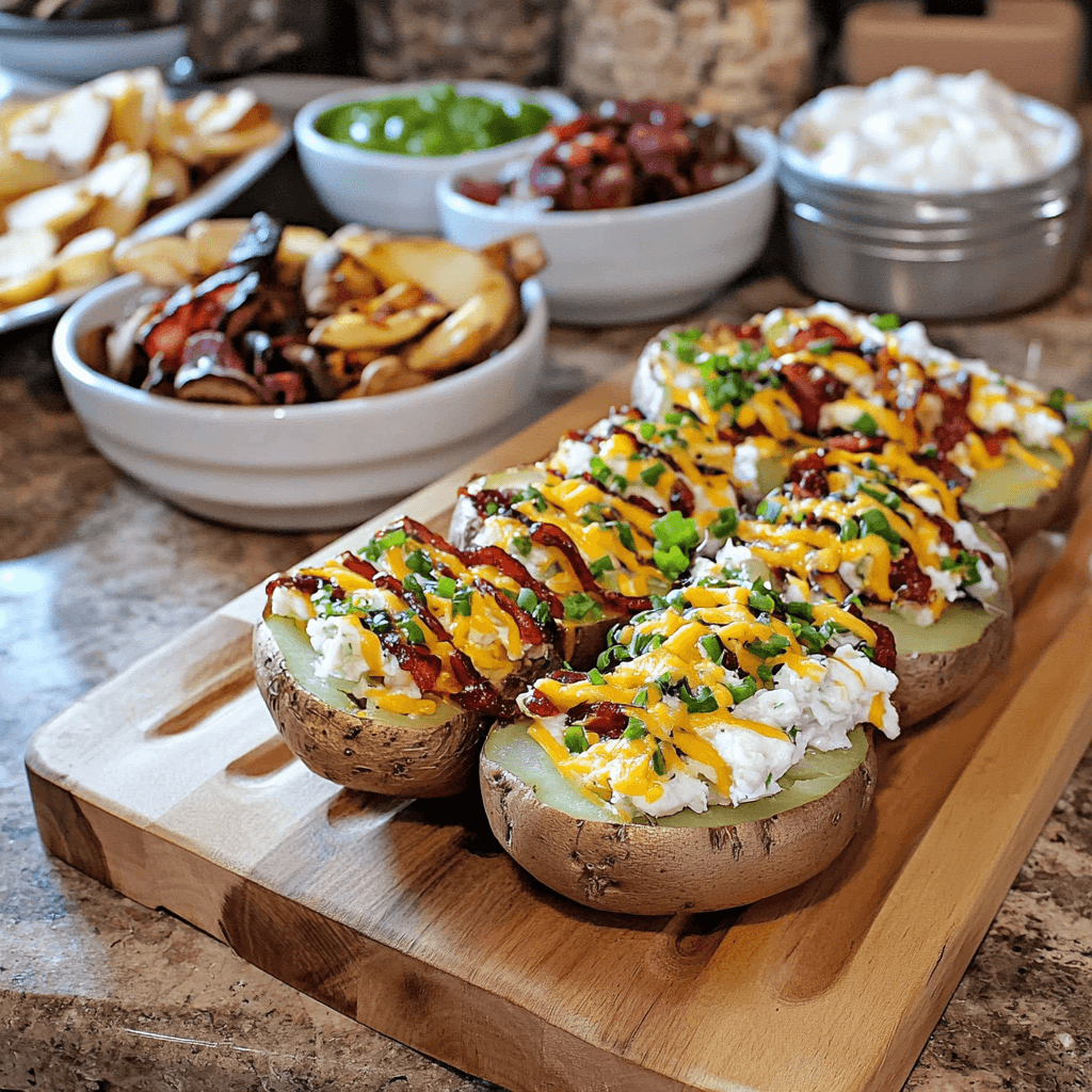 - Arrange the Board: Place the baked potatoes in the center, surround them with bowls of toppings.