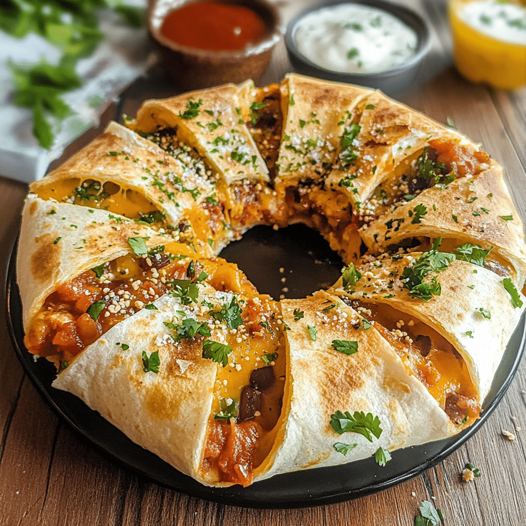 Blooming Quesadilla Ring is a stunning, cheesy, and flavor-packed appetizer that’s perfect for sharing! This eye-catching dish features golden, crispy quesadilla wedges arranged in a ring, loaded with gooey melted cheese, seasoned chicken, and your favorite toppings. It’s a fun and delicious way to enjoy quesadillas, making it ideal for game days, parties, or family gatherings.
