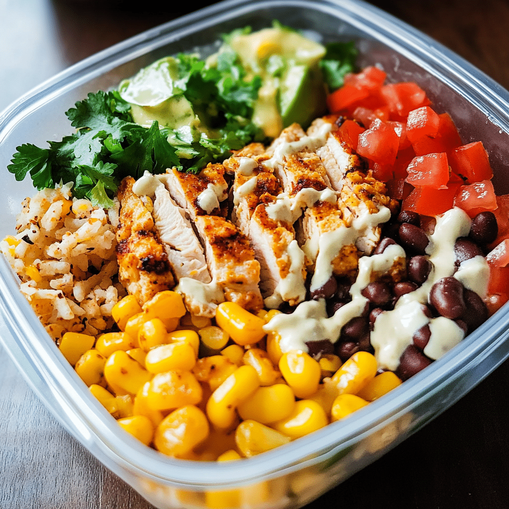 - Assemble the Bowl: In a bowl, layer the rice, lettuce, diced tomatoes, corn, black beans, red onion, and sliced chicken.
