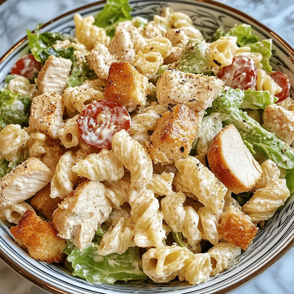 I first made this salad when I was looking for a way to take my love for Caesar salad and turn it into something more filling and substantial. The creamy Caesar dressing coats the pasta beautifully, while the grilled chicken adds protein and heartiness. The croutons bring a satisfying crunch, and the parmesan cheese gives a rich, savory finish to each bite.