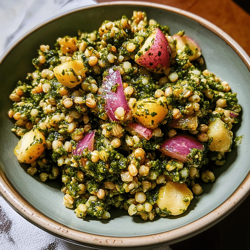 Grain Salad with Use-It-All-Up Pesto is a vibrant and nutritious dish that combines hearty grains, fresh vegetables, and a flavorful pesto made with whatever herbs and greens you have on hand. This salad is perfect for utilizing leftover herbs, wilting greens, or even vegetable scraps, reducing food waste while creating a delicious, fresh meal. The pesto can be made from basil, parsley, arugula, or even spinach, mixed with garlic, nuts, olive oil, and Parmesan for a rich, zesty flavor.