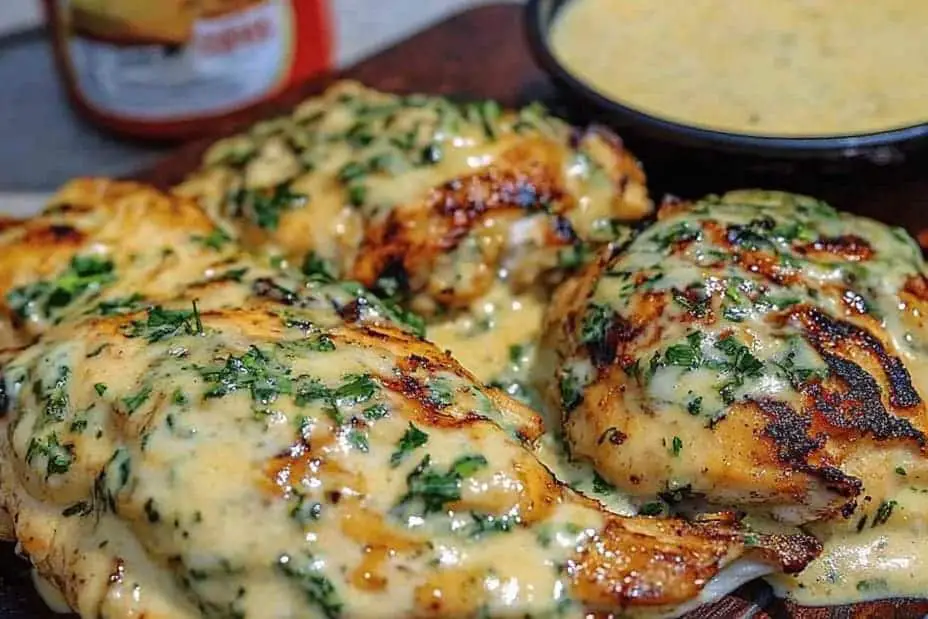 8. Serve: Once the chicken is grilled, remove from the grill and let it rest for a few minutes. Serve drizzled with the cream sauce and garnish with fresh herbs.