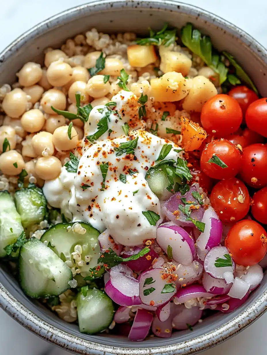 The Mediterranean Quinoa Cottage Cheese Bowl is not just a meal; it’s a celebration of wholesome ingredients and vibrant flavors. This bowl provides a delightful combination of textures and nutrients that cater to a variety of dietary needs. Enjoy it fresh, or customize it to your taste, making it a versatile dish that can be served at any occasion. Whether for a quick lunch, an energizing snack, or a simple dinner, this bowl is bound to impress!