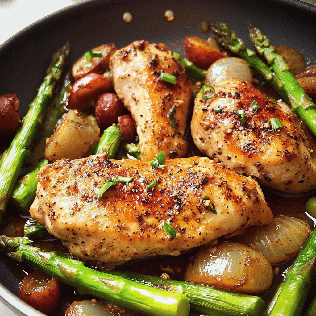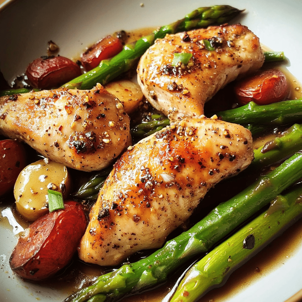 One-Pan Balsamic Chicken and Asparagus is a quick and flavorful dish that combines tender chicken breasts with roasted asparagus, all cooked in a single pan. The chicken is marinated in a rich balsamic glaze that gives it a sweet and tangy flavor, which infuses the asparagus as everything roasts together. This one-pan wonder is not only easy to make but also perfect for busy weeknights or a simple dinner that feels special.