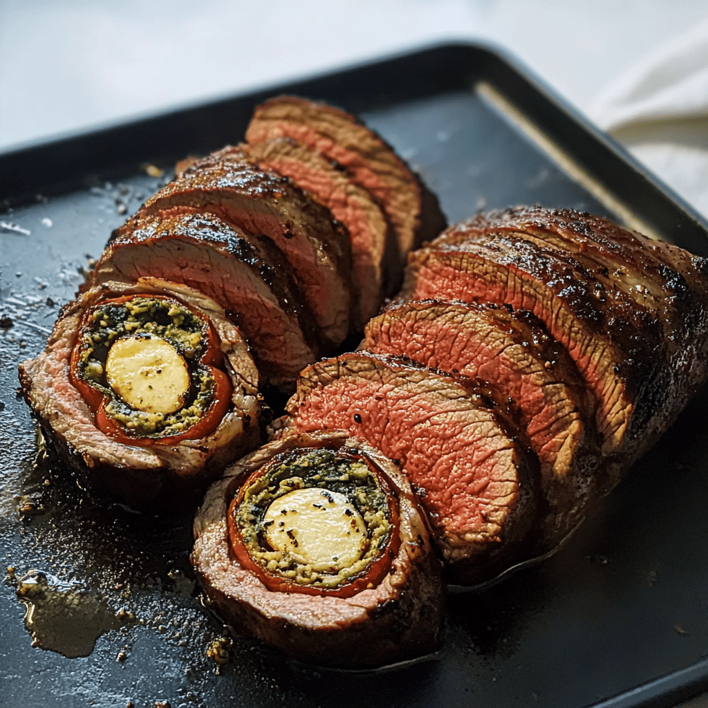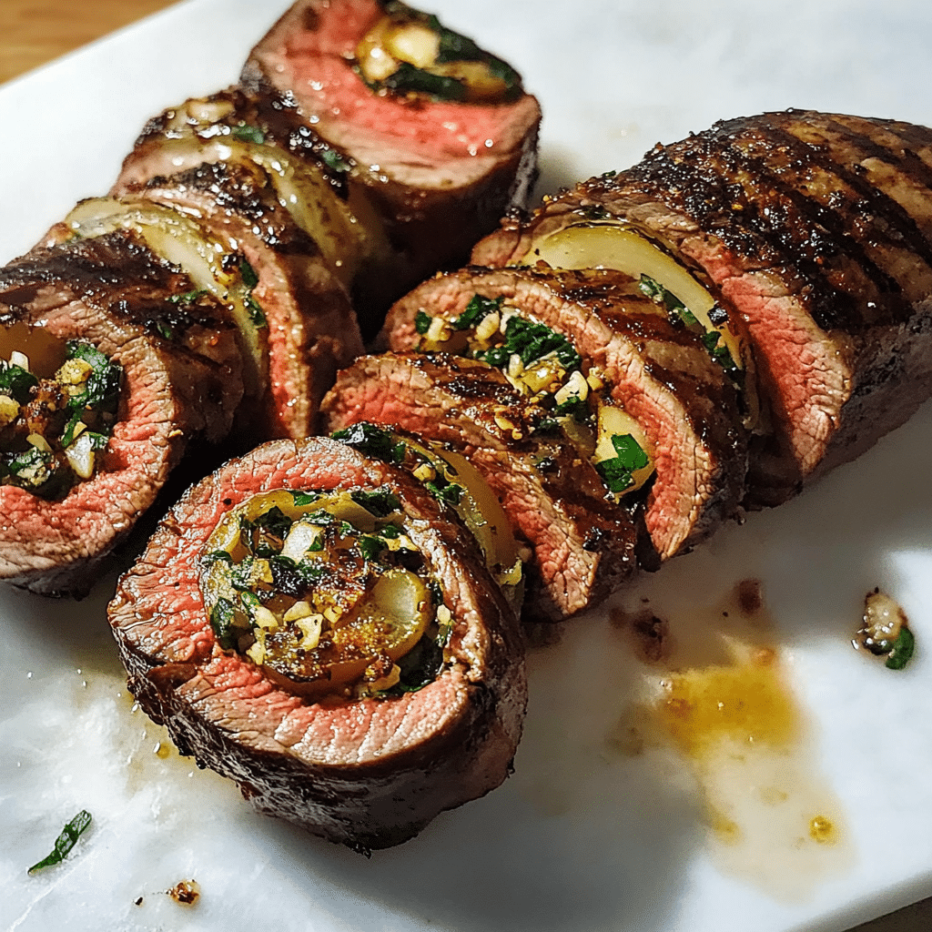 Pepper-Stuffed Grilled Flank Steak is a bold, flavorful dish that brings together the rich taste of flank steak with the savory heat of stuffed peppers. The steak is grilled to juicy perfection and then sliced open to reveal a hearty filling of bell peppers, onions, and spices, which add a burst of color and flavor. The smokiness from the grill perfectly complements the stuffed filling, making each bite a delicious, satisfying experience.