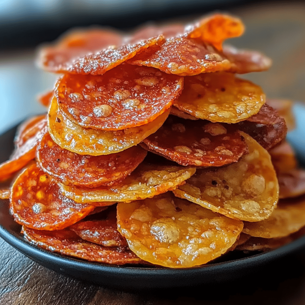 Pepperoni Cheese Crisps are a delicious, savory snack that combines the rich, salty flavor of pepperoni with the crispy crunch of melted cheese. The cheese crisps are made by baking or frying slices of pepperoni and shredded cheese until they become perfectly crispy and golden. These bite-sized treats are perfect for snacking, serving as an appetizer, or even adding to salads or charcuterie boards for extra flavor and crunch.