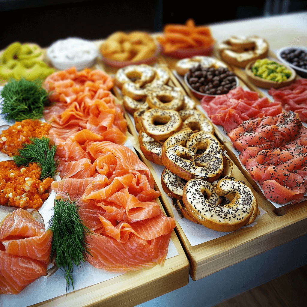 - Set Up the Bar: Arrange all the ingredients—bagels, smoked salmon, cream cheese spreads, toppings, and garnishes—on a large table or counter, allowing guests to assemble their own bagels.