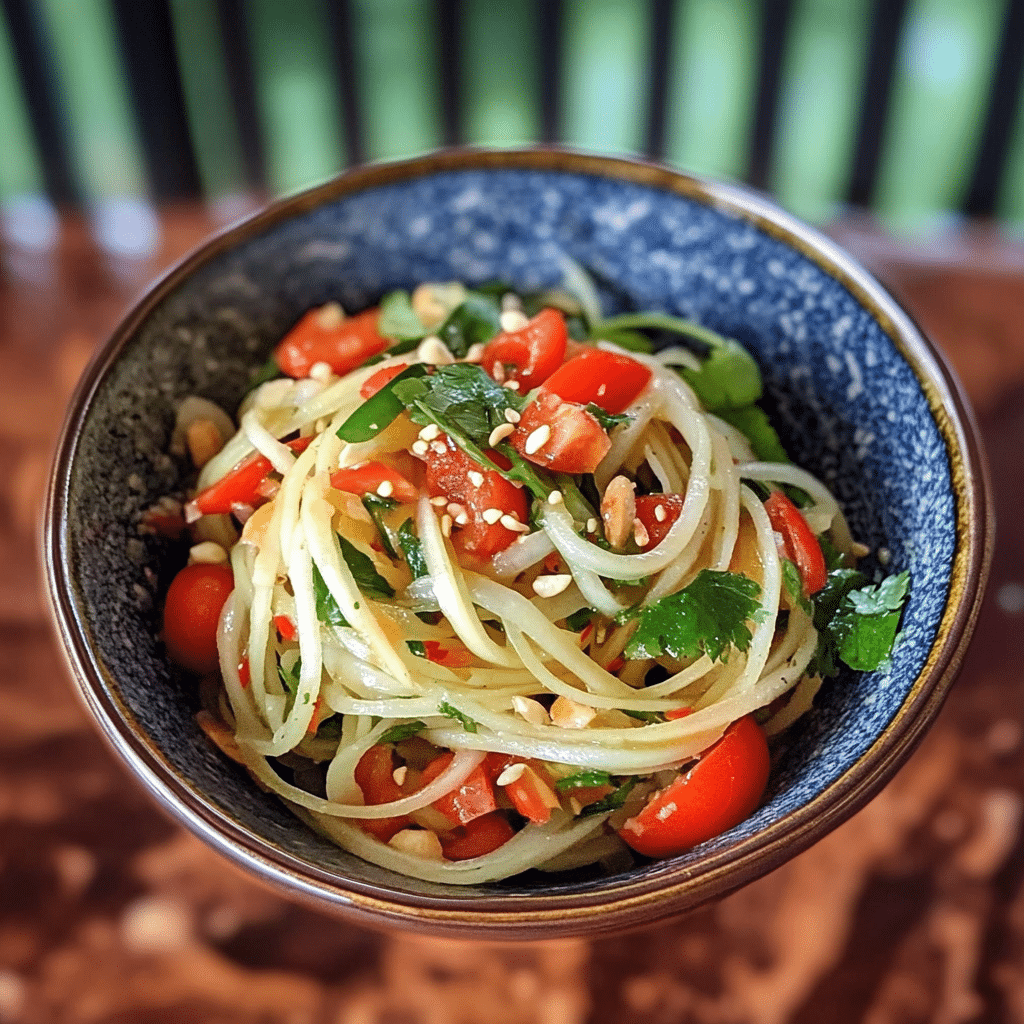 Thai Green Papaya Salad (Som Tam Thai) is a refreshing, bold, and flavor-packed dish that perfectly balances sweet, sour, salty, and spicy elements. Made with crisp shredded green papaya, juicy tomatoes, crunchy peanuts, and fresh herbs, all tossed in a vibrant lime-fish sauce dressing, this salad is a true explosion of Thai flavors.