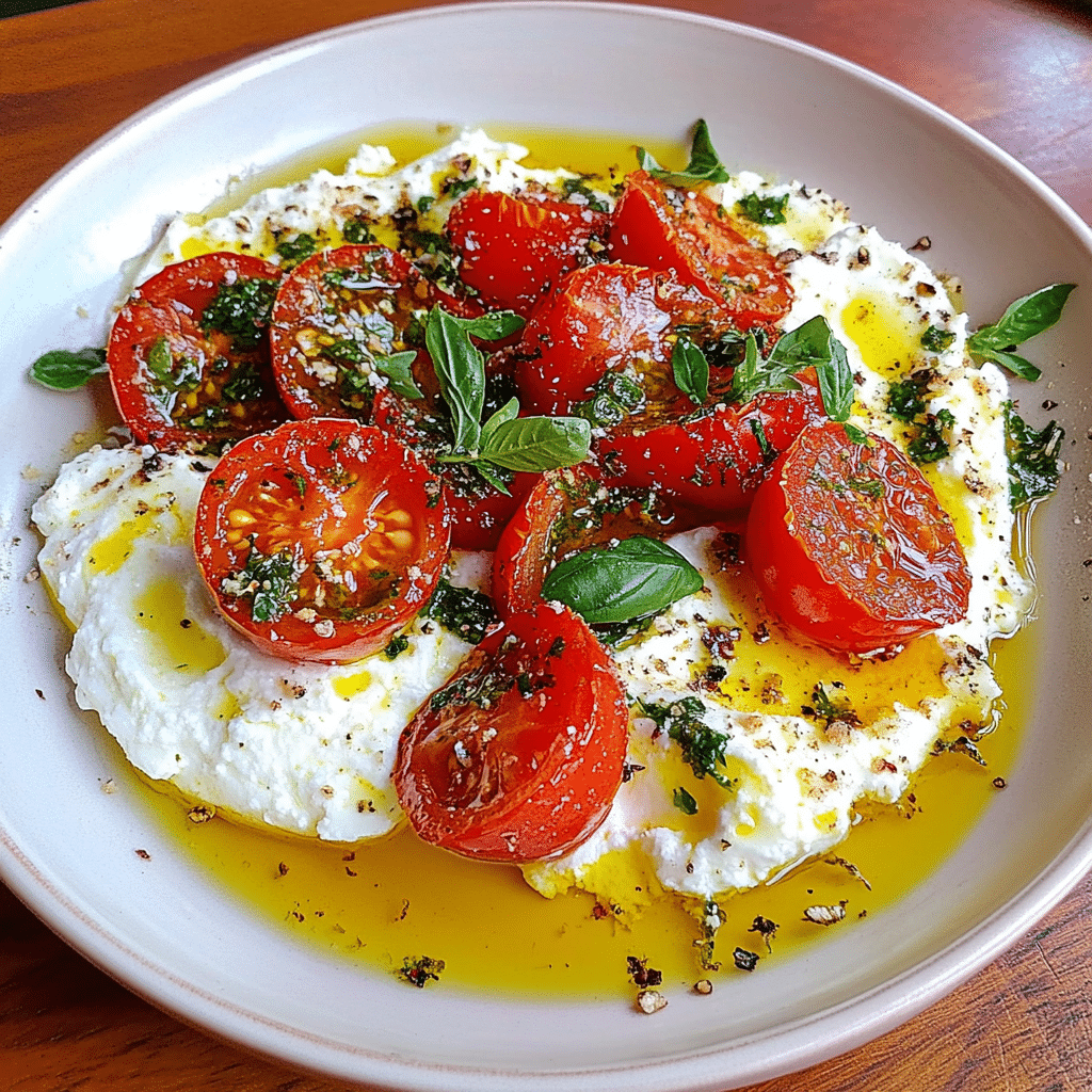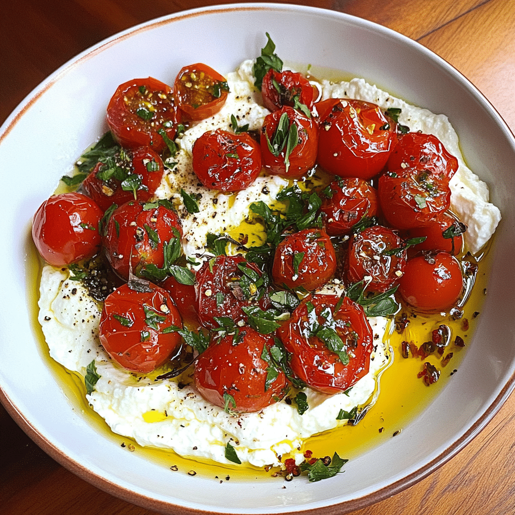 Tomato Confit and Whipped Feta is a vibrant and flavorful dish that combines slow-cooked, caramelized tomatoes with a creamy, tangy whipped feta spread. The tomatoes are cooked in olive oil with garlic, herbs, and a pinch of salt until they burst and become soft, rich, and slightly sweet. Paired with the smooth, fluffy whipped feta, which is made by blending feta cheese with olive oil, lemon juice, and a touch of cream, this dish is a perfect balance of savory, tangy, and fresh flavors.